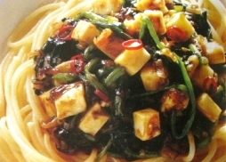ゆで上がったスパゲティをフライパンに入れて一炒め、にら、いり卵を加えてさっと混ぜ皿に盛って出来上がり。