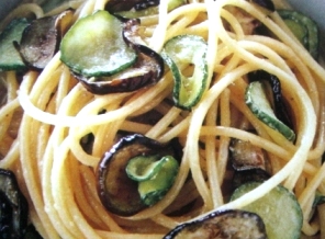 フライパンにサラダ油を熱してゆで上がったスパゲティを入れさっと炒める。なすときゅうりを入れ中火で1~2分炒め合わせ、わさびマヨネーズを入れ全体を混ぜたら火を止めて皿に盛り出来上がり。